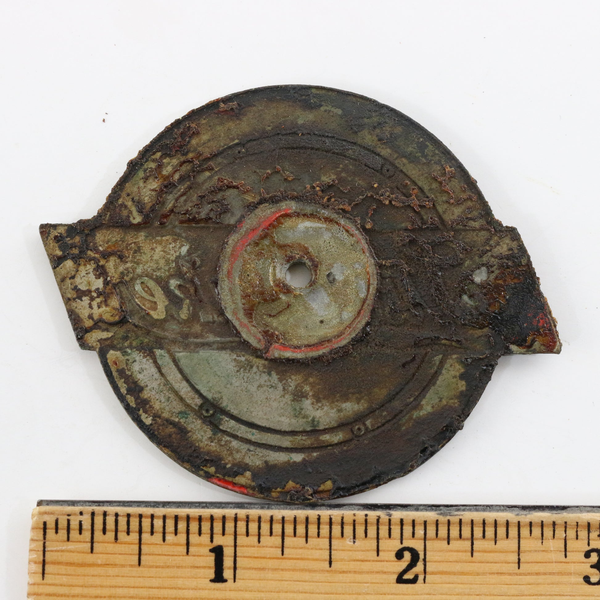 Vintage item may show some age or blemishes as shown in photos. Please ask any questions you may have prior to bidding or buying. Some grime/rust is present. We did not wish to clean or attempt to restore in case of damage to the item. Shows some age wear & blemishes as shown. Some enamel loss as shown. Item has holes as shown from being previously mounted.